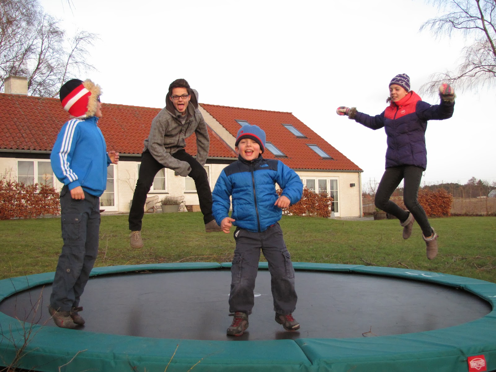 Jumping on the backyard trampoline at our house just outside of Copenhagen. |